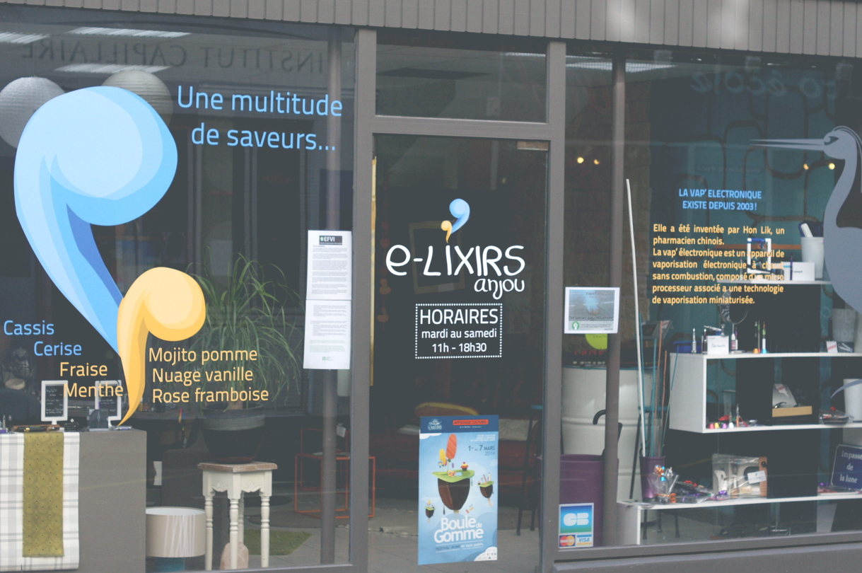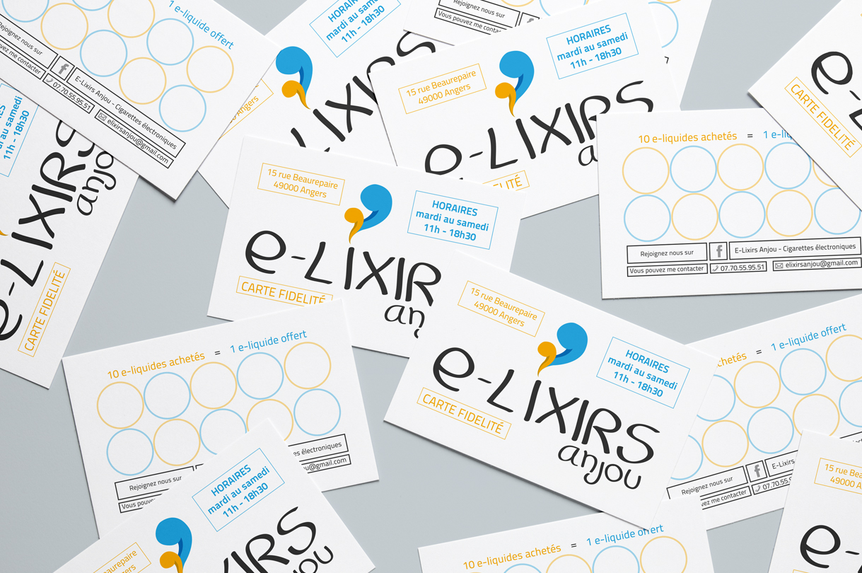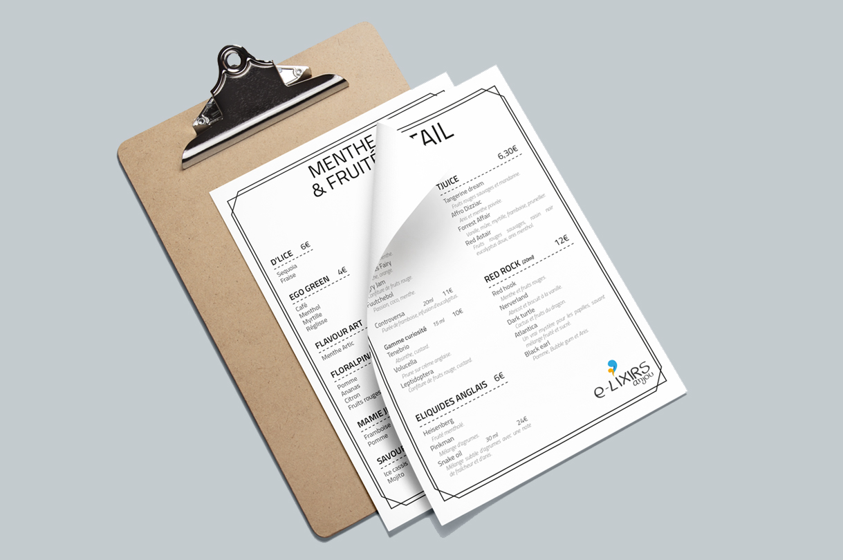 Création de la charte graphique (logo, carte de fidélité, cartes des saveurs, vitrine, affiche bus, insertions) d'un magasin de cigarettes électroniques situé à Angers.